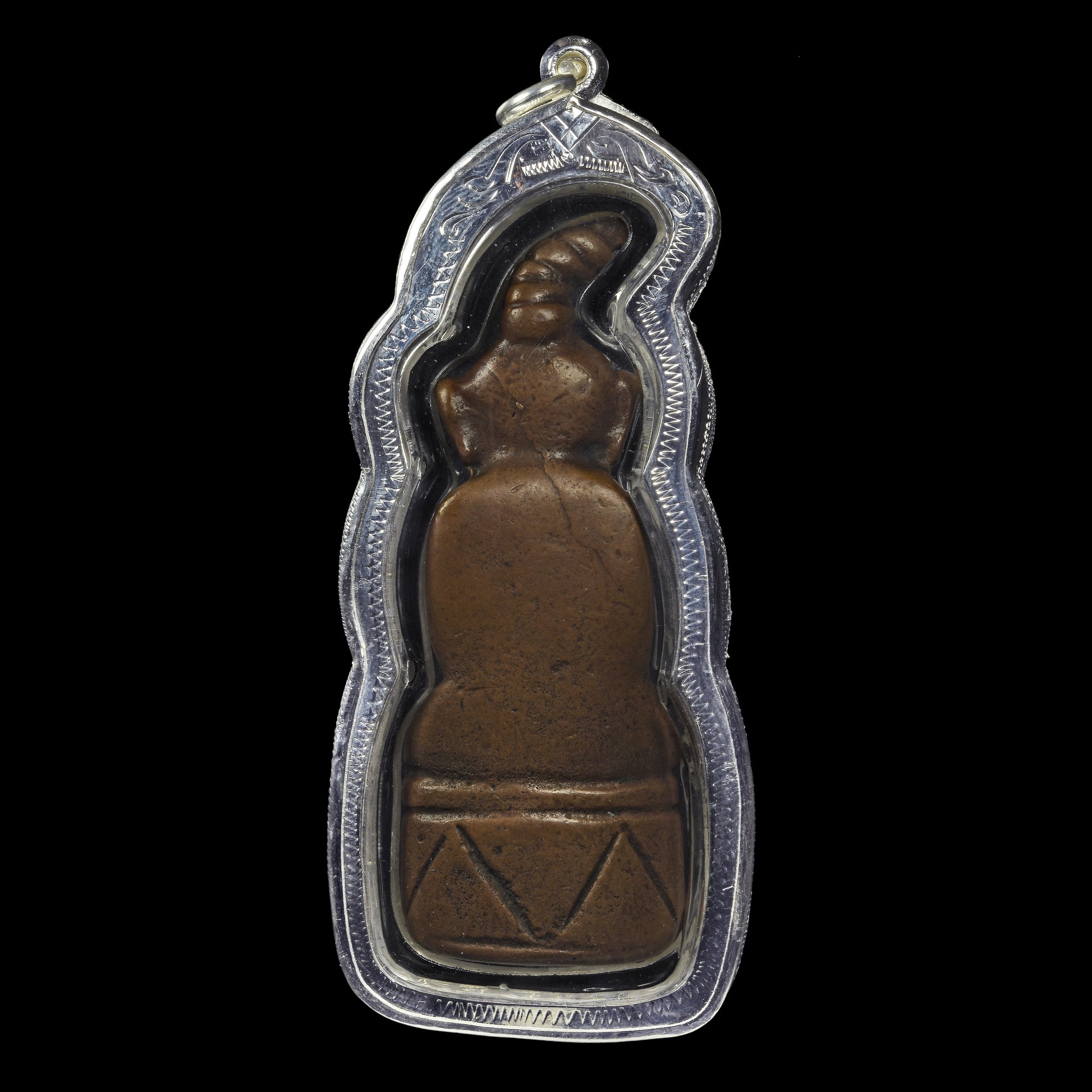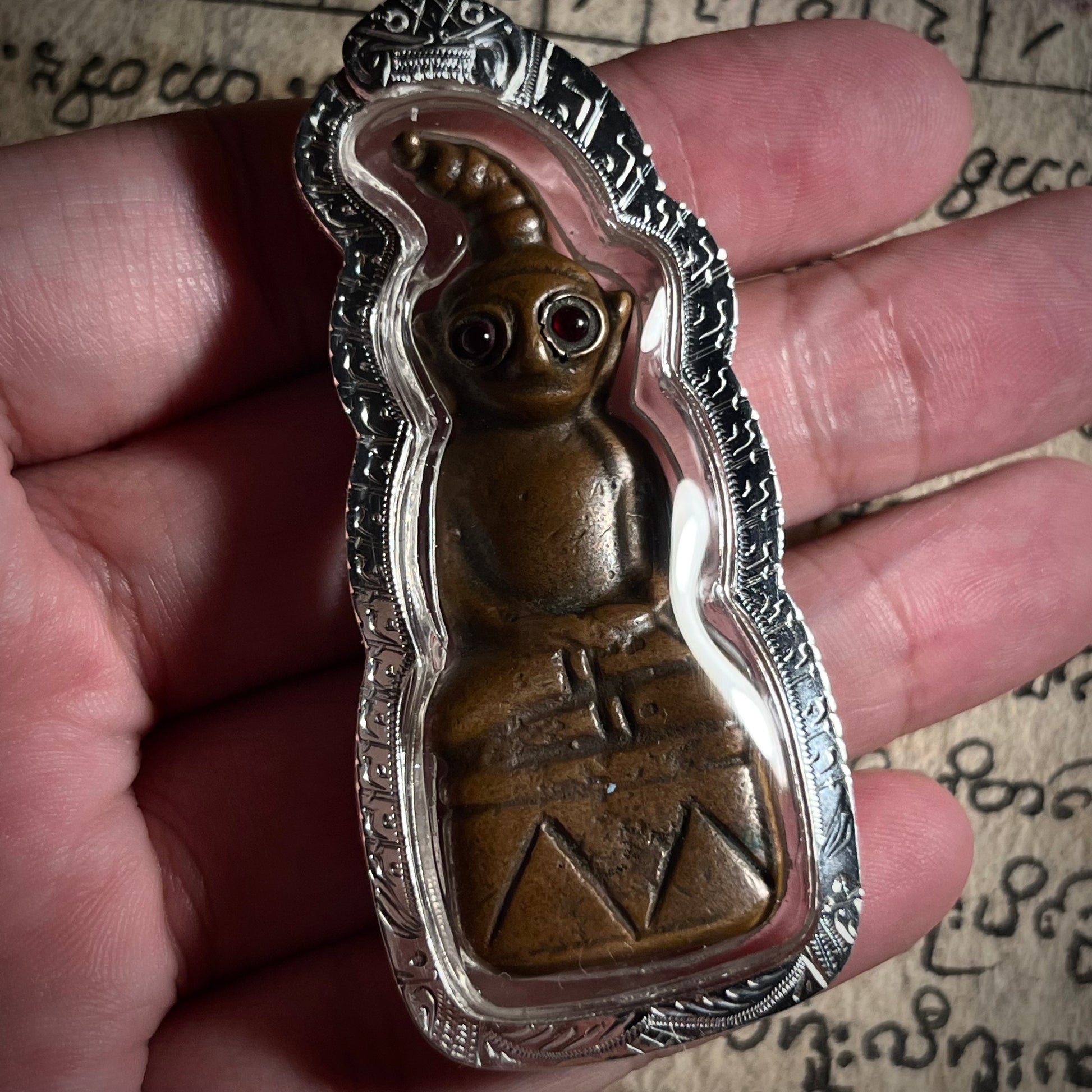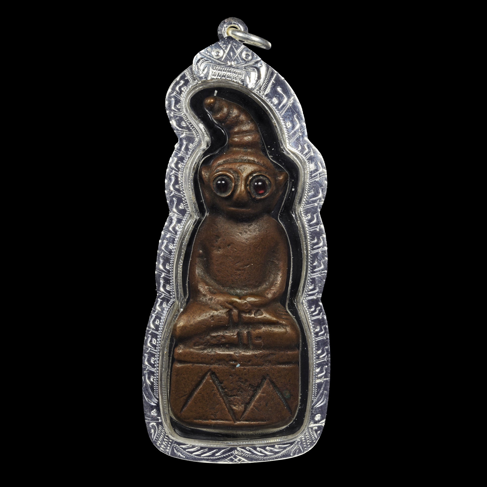 距今大约60年左右,恭请自阿赞纳霖;此件作品的独特之处:它是凸眼 Ngang 家族中罕见的款式之一。它的眼睛很圆,形似蚱蜢的眼睛。此件作品由纯野生铜制成,这在 Ngang 护身符中并不常见。底座下方有类似钟形物体的小珠,可见锈迹和岁月痕迹。这种款式非常罕见,肉质紧实,包浆圆润,收藏稀有 Ngang 的藏家不容错过,不可多得的收藏美品。