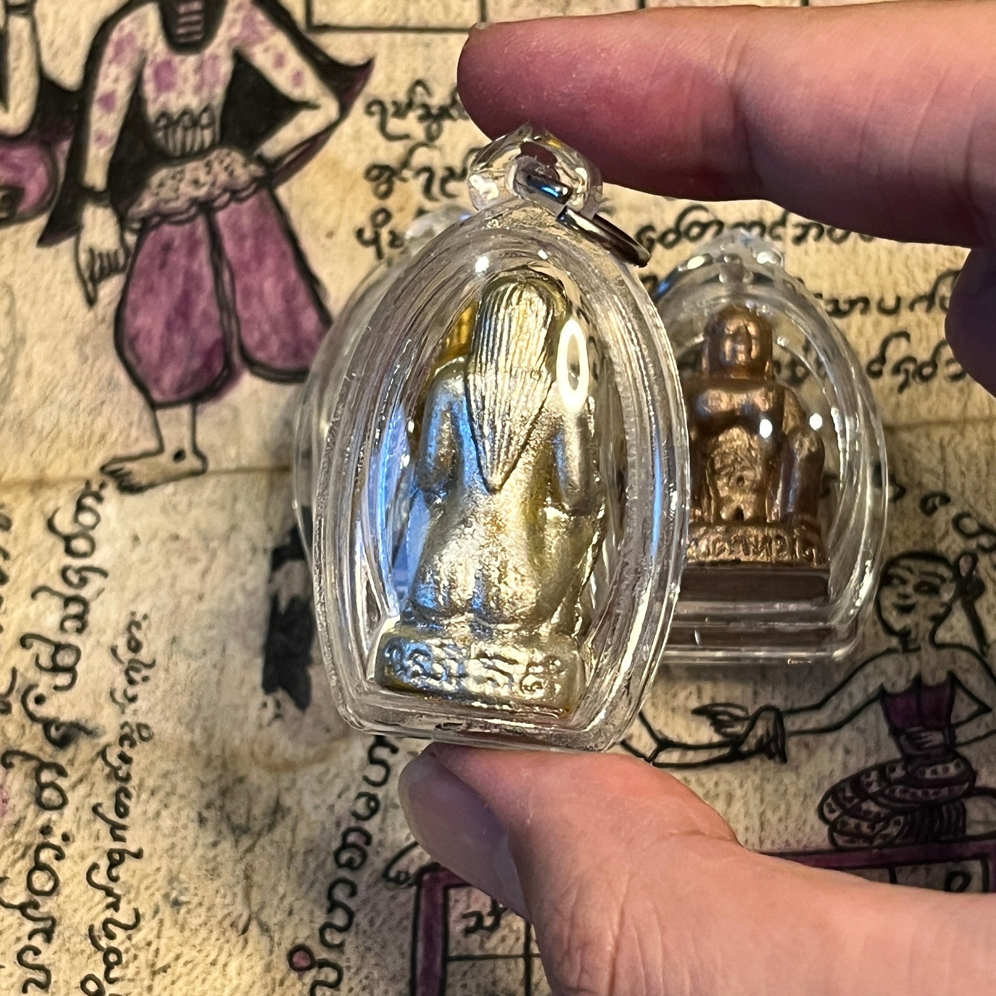 咩卡蒙女神堪称阿赞奥的成名之作之一。当时(佛历2420年左右),卡蒙是位貌美如天仙的女子,倾国倾城的她令众人倾慕。彼时,阿赞奥的师祖阿赞柳正是当地著名的驱魔白衣法师,他希望能让人们拥有像咩卡蒙一样的魅力。经过师祖的加持,咩卡蒙化身为地仙而非凡俗之物,得以进入寺庙修行、法力无边,不惧灭魔。在泰国东北部,信奉咩卡蒙的信徒数不胜数。此版本尤为珍贵,力量非凡。除了法痴阿赞奥的加持外,更有泰北神使阿赞北的护佑。两位师傅长期加持,旨在提升自身运势、异性缘与魅力、增强吸引力、锁定姻缘、挽回感情、提升性魅力,更能有效抵御招来是非小人的诱惑,尤其对财运、偏财及彩票赌博等幸运之事大有裨益。