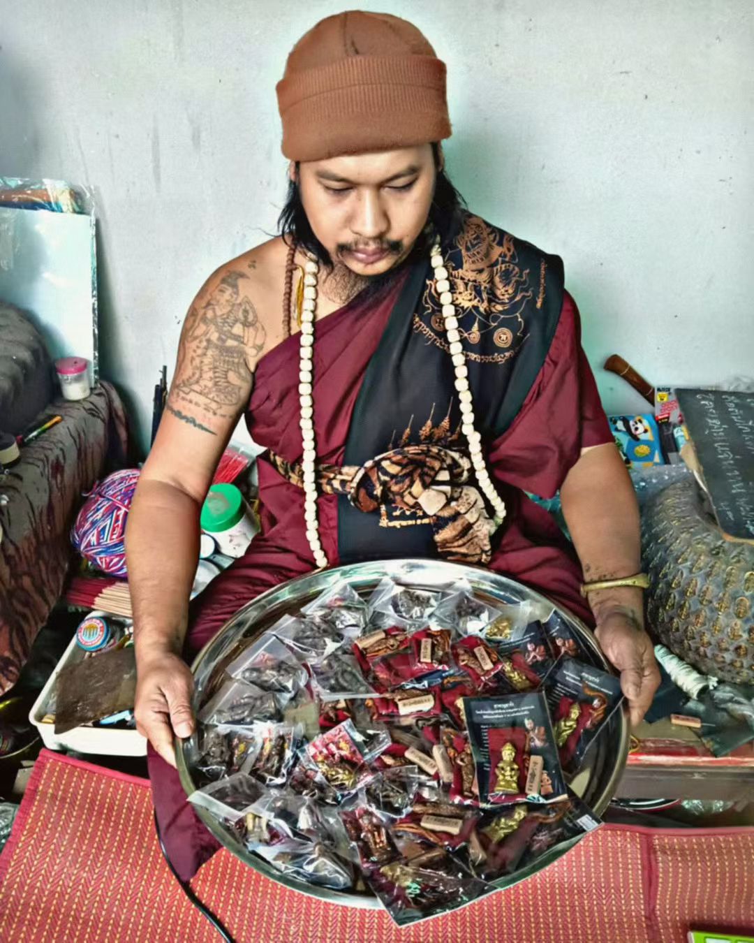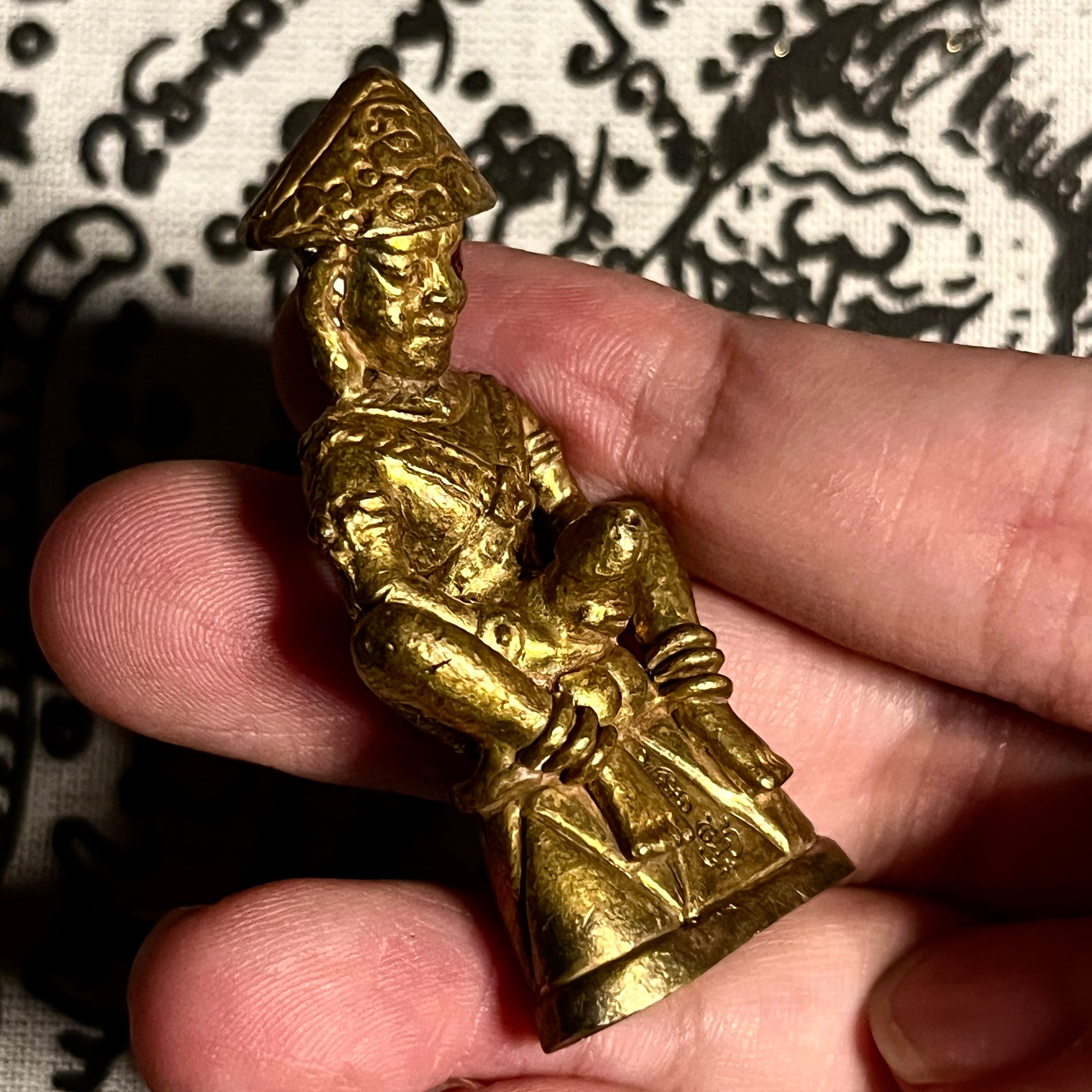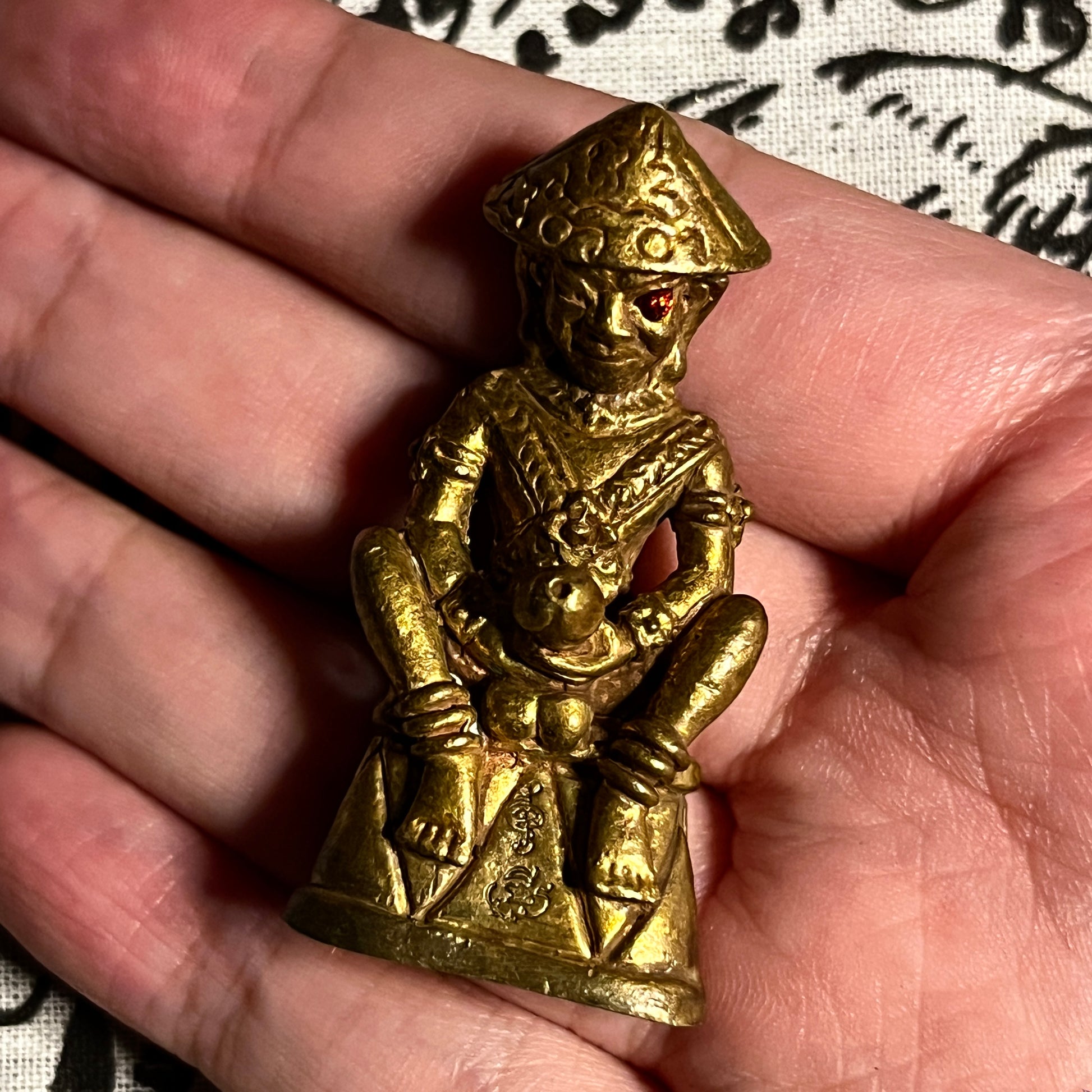 至于这尊中国风男像的供奉,Arjarn Jiam 将其供奉为象征魅力、慈悲、性感和情欲,因为如今我们不再像战争时期那样战乱不休。大多数人都渴望提升自己的事业、生意和财务状况,并在爱情上获得成功。中国风男像的设计风格独特,头戴帽子,身着类似古代士兵的服饰,手握象征性别的阳具。