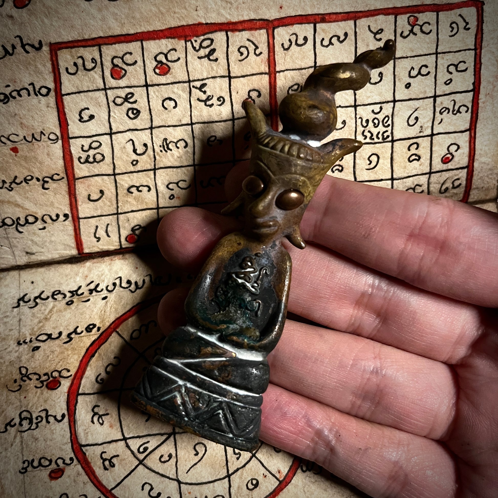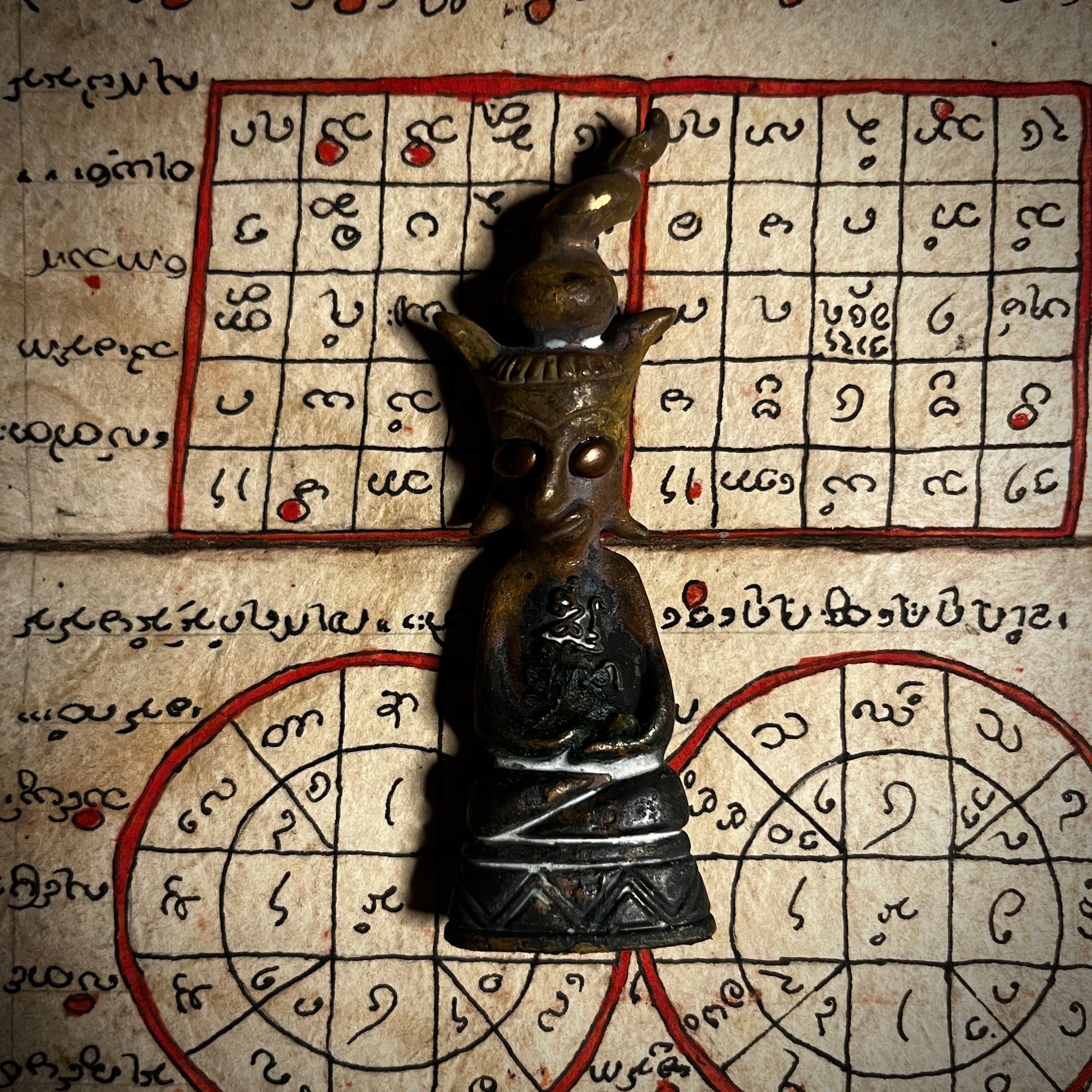 蒙拉曼魅力咒师阿赞·姜(Arjarn Jiam)以其强大的蒙拉曼传承法术而闻名,他带来了Phaya Ngang Chakrapat Chan Siew(新月皇帝咒)。这枚神圣的护身符蕴含 着神秘的力量,尤其擅长提升魅力、慈悲、人缘、财富、保护和无敌,而所有这些力量都蕴含在一枚护身符之中。