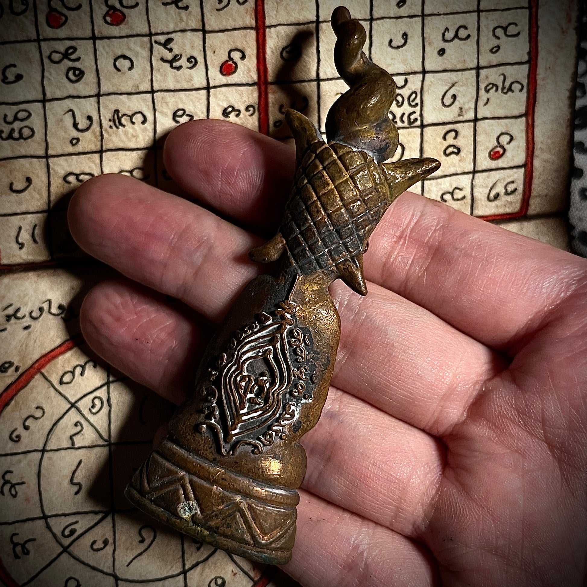 Arjarn Jiam 将 20 多年与神圣拍婴相关的知识和经验倾注于这尊特别版 Ngang。 此版本遵循古老信仰中关于传统 Ngang 的特征而精心制作: “盘绕的发髻、歪嘴、红眼、长脸、下垂的耳朵和鱼骨状的底座,所有这些都是正宗老式 Ngang 的标志。” 作品沿袭了世代传承的传统技艺。限量版特别铸造了一批,采用罕见而复杂的泰国泥模铸造技术,这一工艺难度高且耗时长,使其在现代社会愈发稀有。