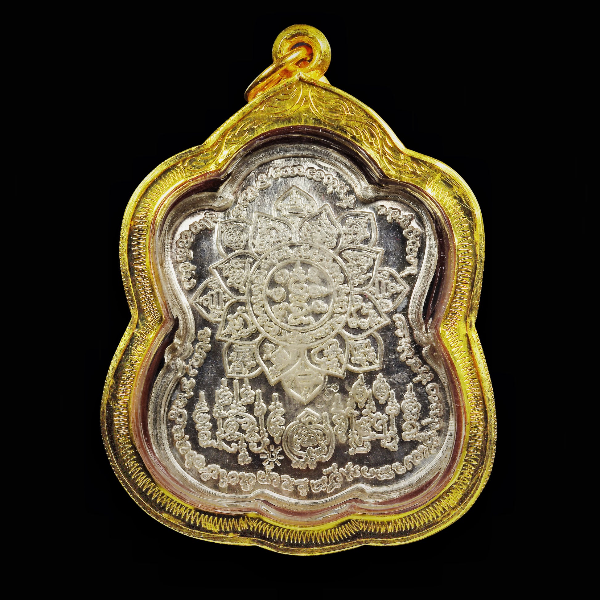 牌的后面主符是聴系最顶级的บัวแก้ว“钵盖”莲花符咒,然后搭配有“拿摸菩它呀”五佛庇佑经咒,陀字符转运符咒,陀字符将军符咒!集合了聴系法脉最为重要的核心经咒!