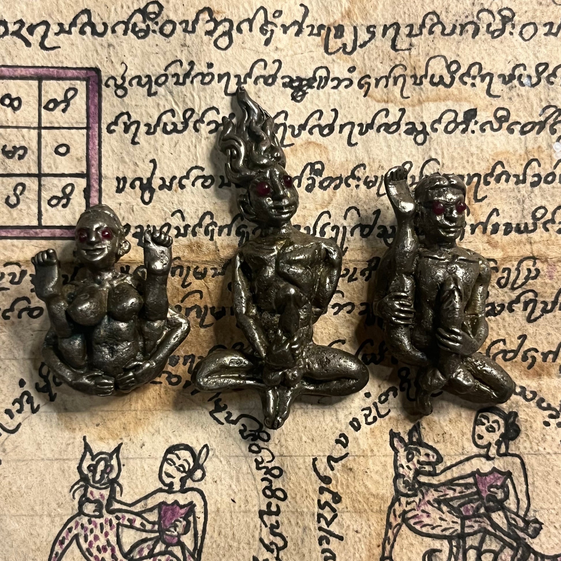 阿赞奥以特制神油浸泡圣物,使力量深渗材质。混合芝麻油、胖大海油与椰子油,施展“三女共井”秘术,每款油代表一种激情:业欲、存欲与虚无欲。此油犹如万灵之母,孕育包括“Ngang”在内的神明。
