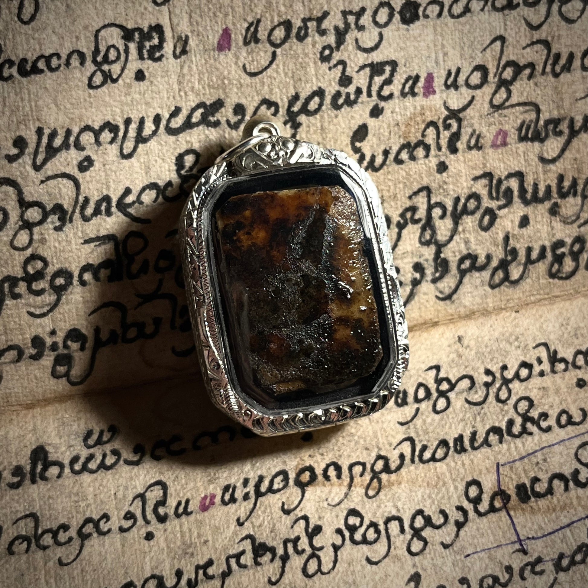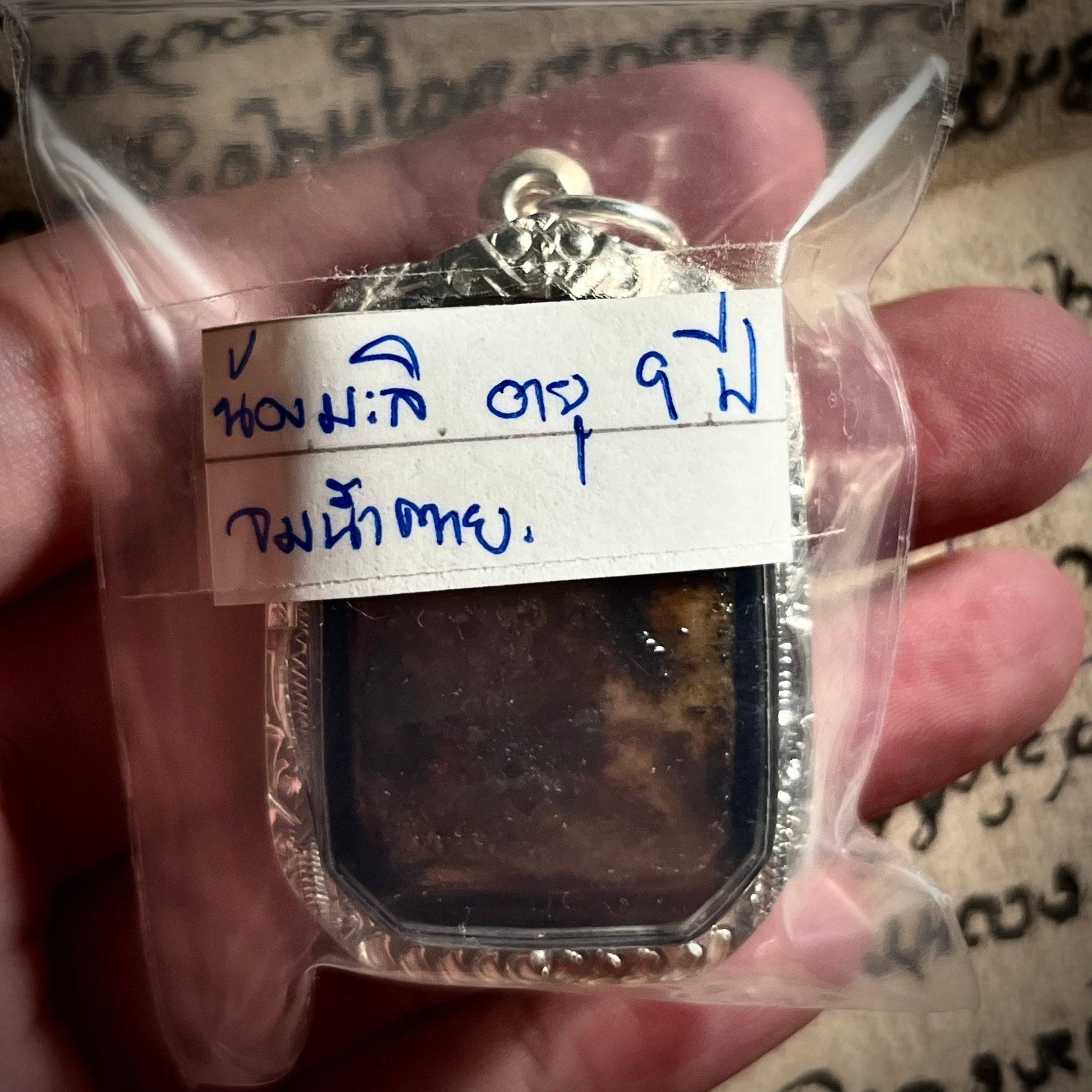 3. 独一制作:由于材料与因缘的独特,此圣物仅此一件,无法复制。阿赞舍将其制作成一件可随身佩戴的额骨饰品,并告知,诚心供奉者,能得到茉莉婴灵的深切庇佑,尤其在守护平安、规避水险及招来善缘方面,传闻有奇效,店主已定制纯银开合壳。