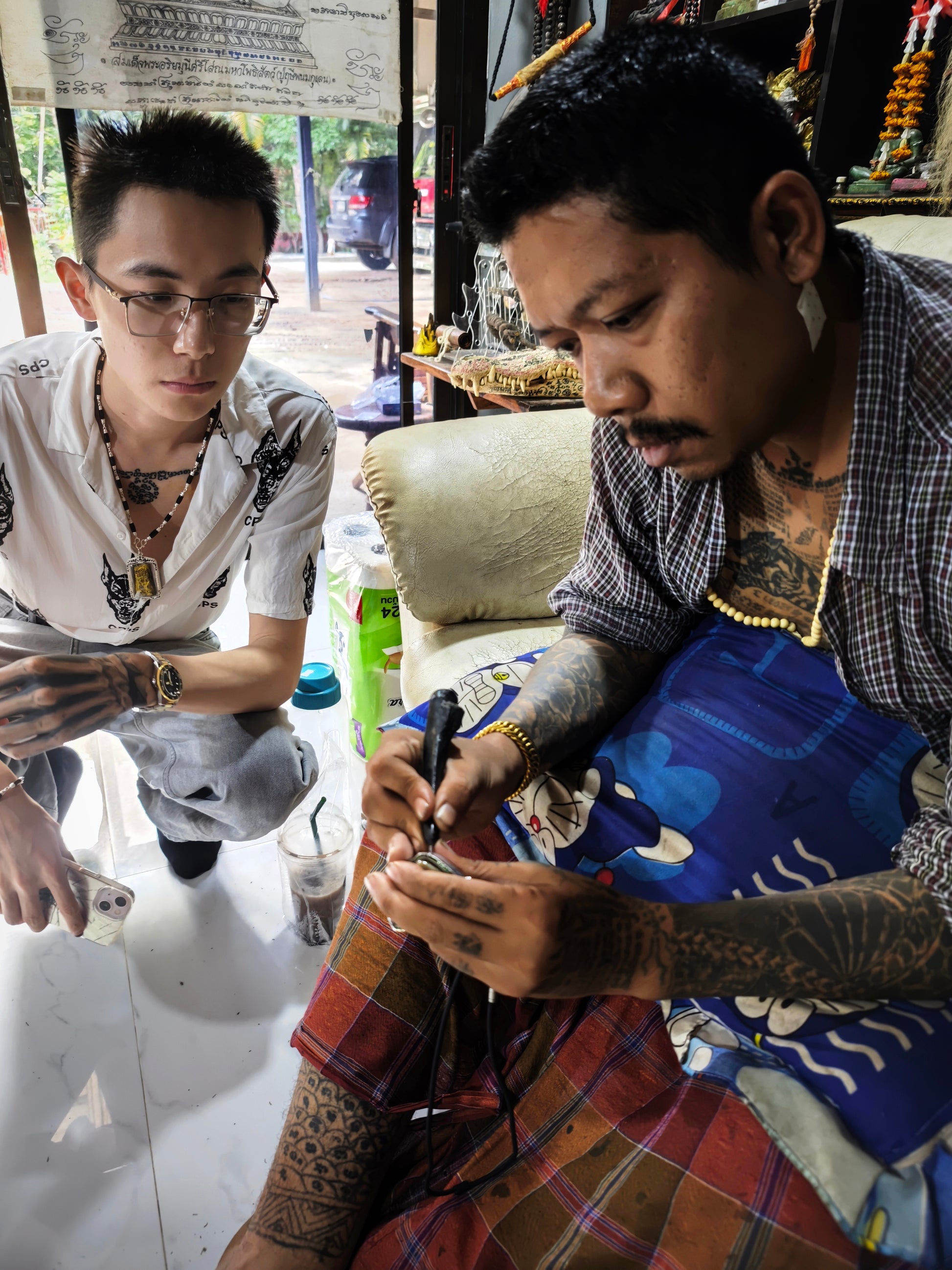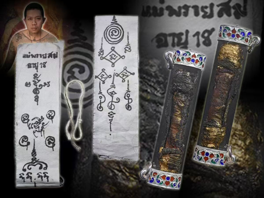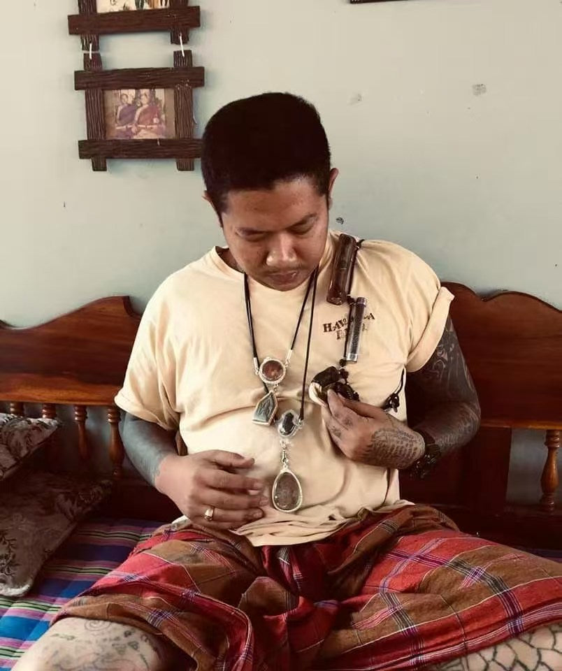 这件物品原本是阿赞瑟的个人持有之物,以供自身使用——“หนังหน้าผากผีตายท้องกลม”(死于非命的孕妇额皮)。此物取自一位18岁怀胎四月、上吊而亡的女子,名为“พรายแม่ส้ม”。制作过程中,需借助秘法仪刀裁取额皮,此等法术并非寻常人可施,唯有内修深厚定力、心志坚韧,方能镇压亡魂、完成仪式。