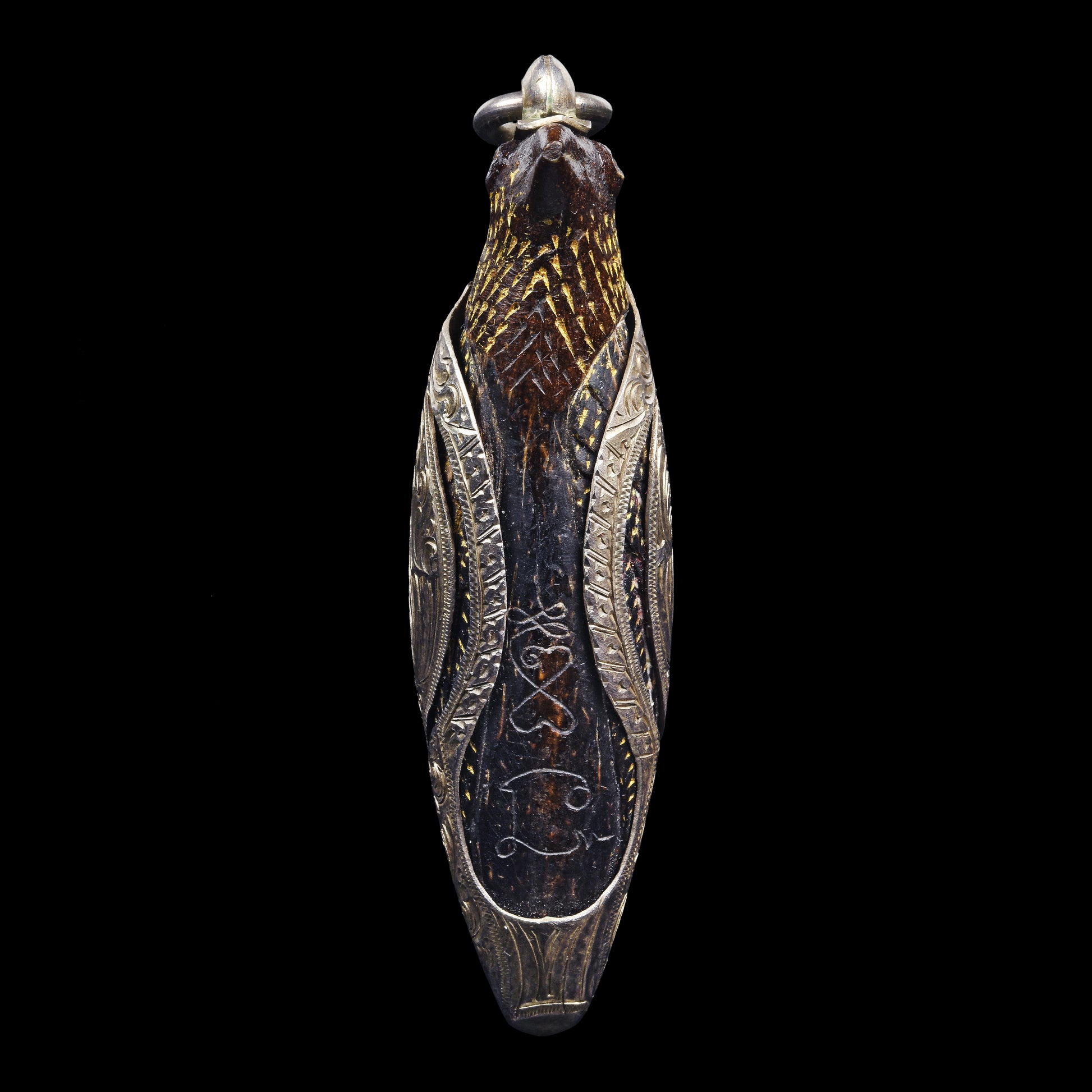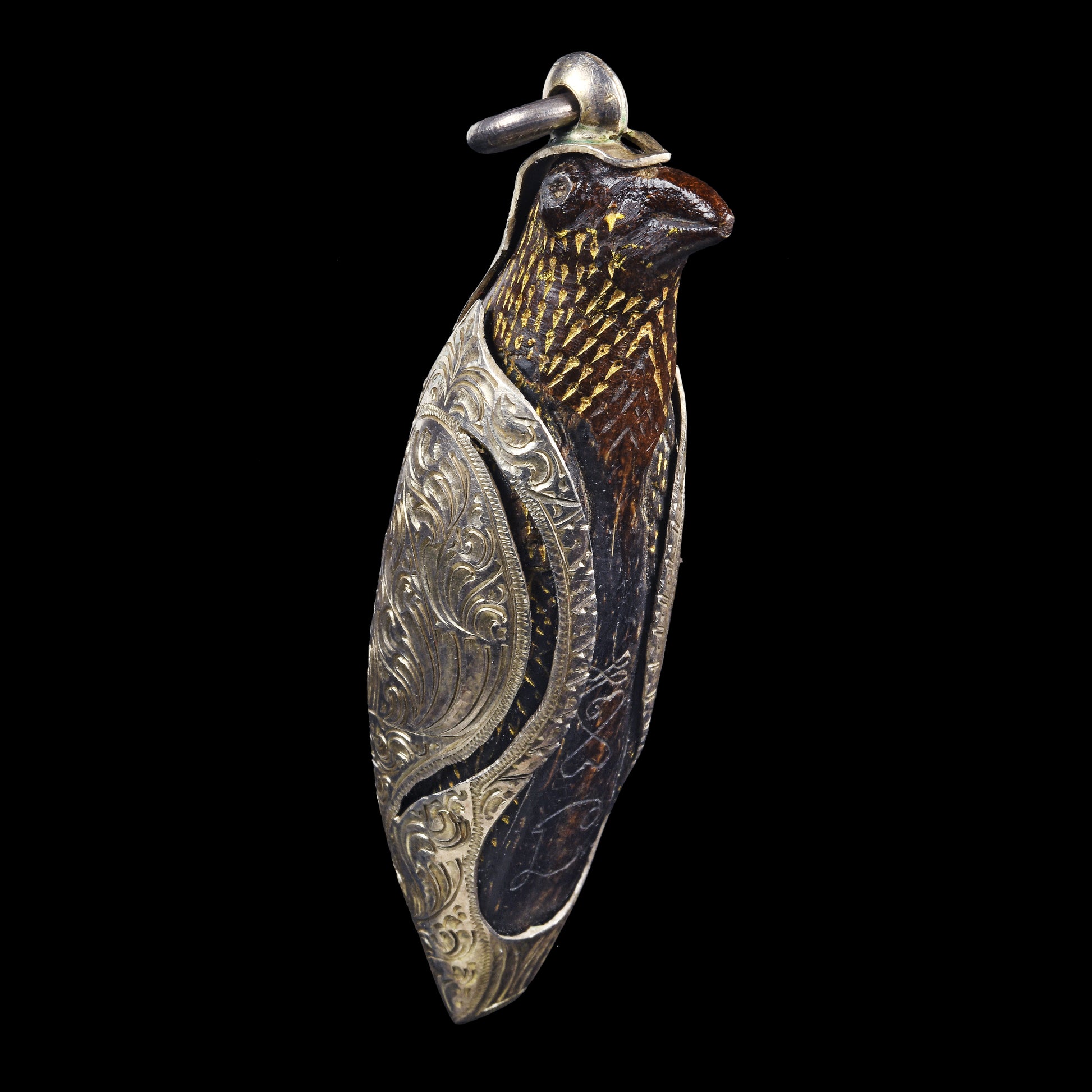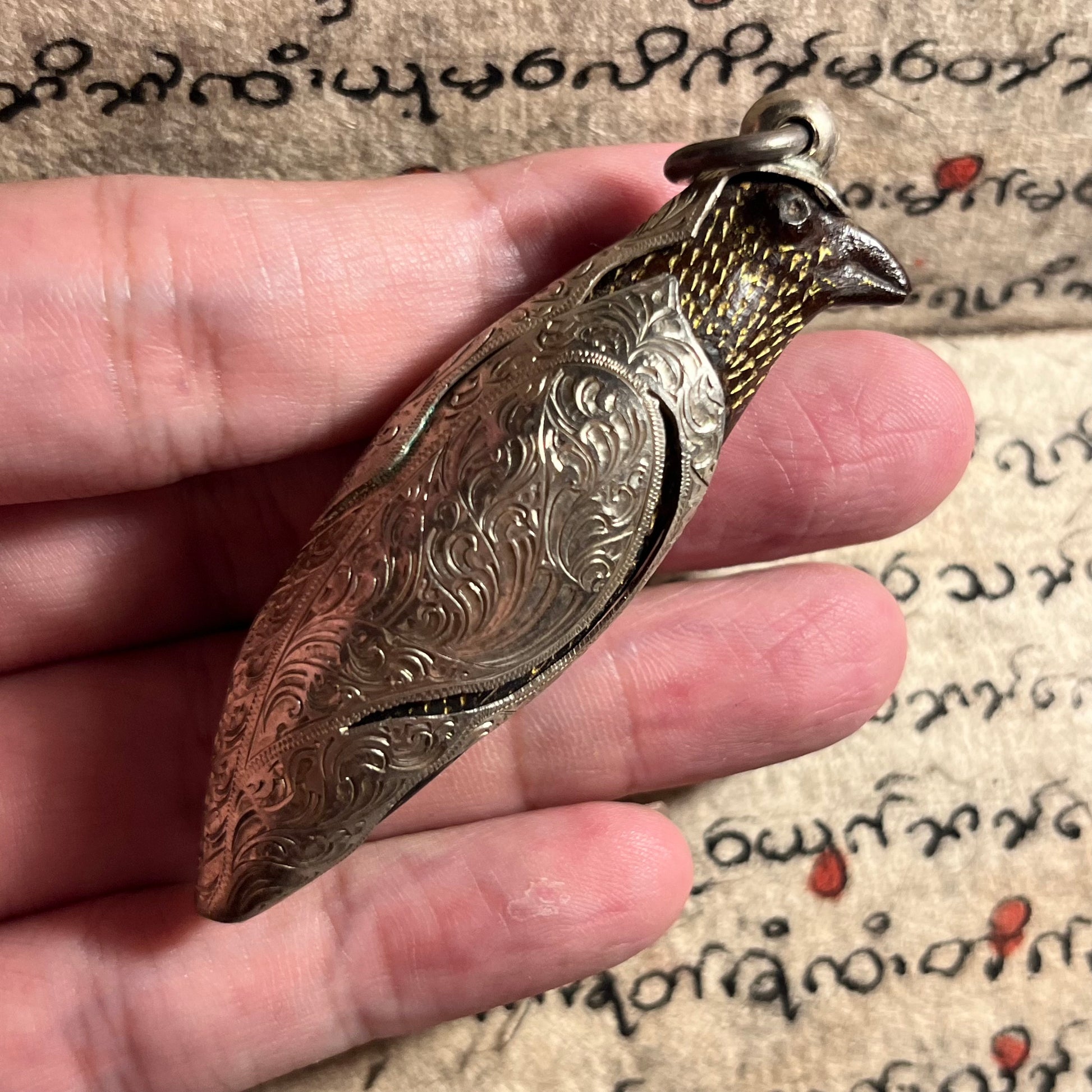 孤品!定制纯银盔甲;迦楼鸟金羽法门,源自“巴拉亚喜”家族秘传,由阿赞迷亲自施法,铭刻萨里嘎鸟符文(นะสาลิกา)及慈爱魅力符文(นะเสน่ห์เมตตา)。此法门将能量注入小型椰壳,并精雕成迦楼鸟之形,赋予其强大的佛法能量。