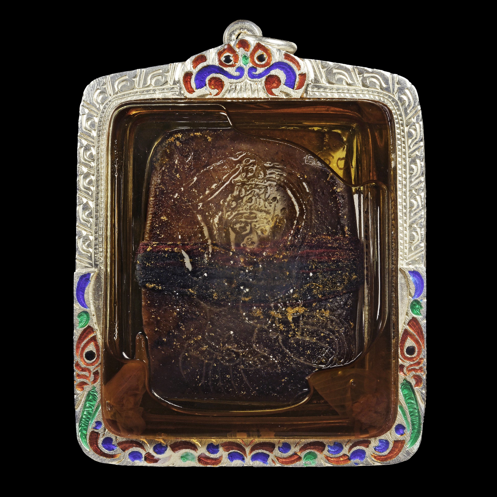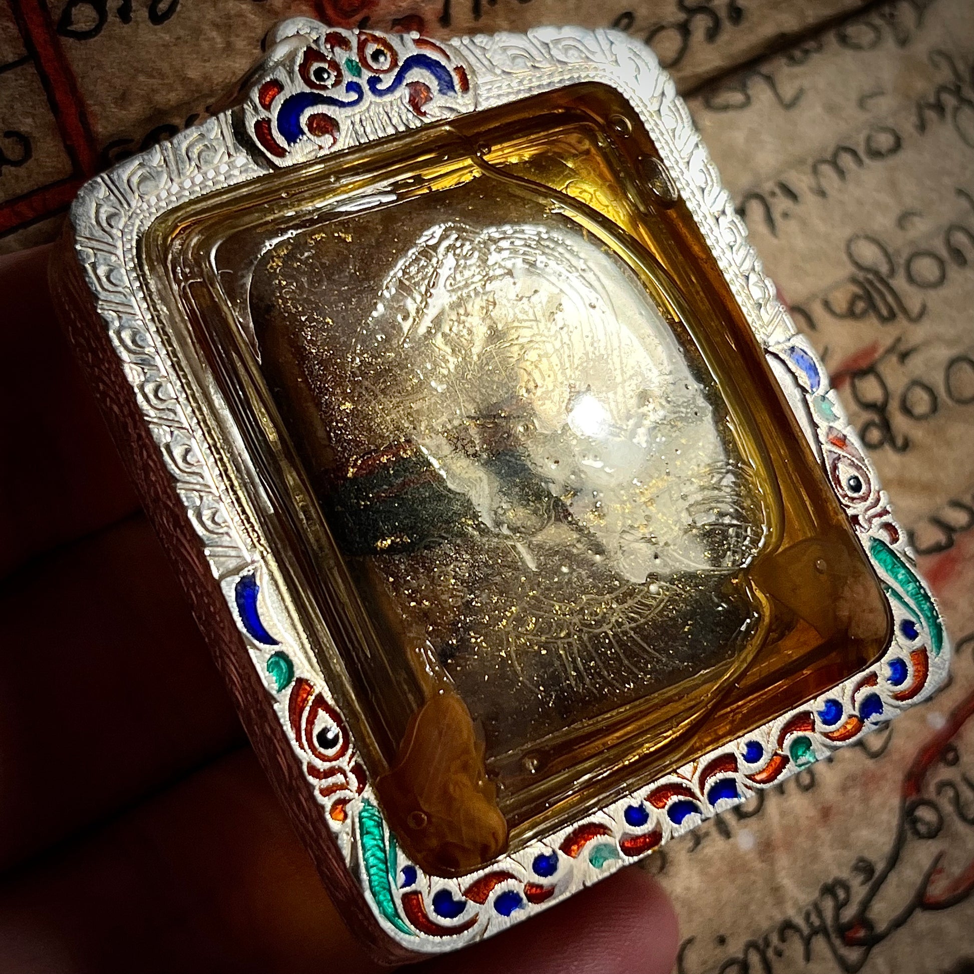 定制珐琅银壳,双层亚克力防水内胆,中间注入纯湾多通油,保持滋养和力量的同时,也不会浸泡到宾灵本身,同时也可以保护大地女神的法相和符文。