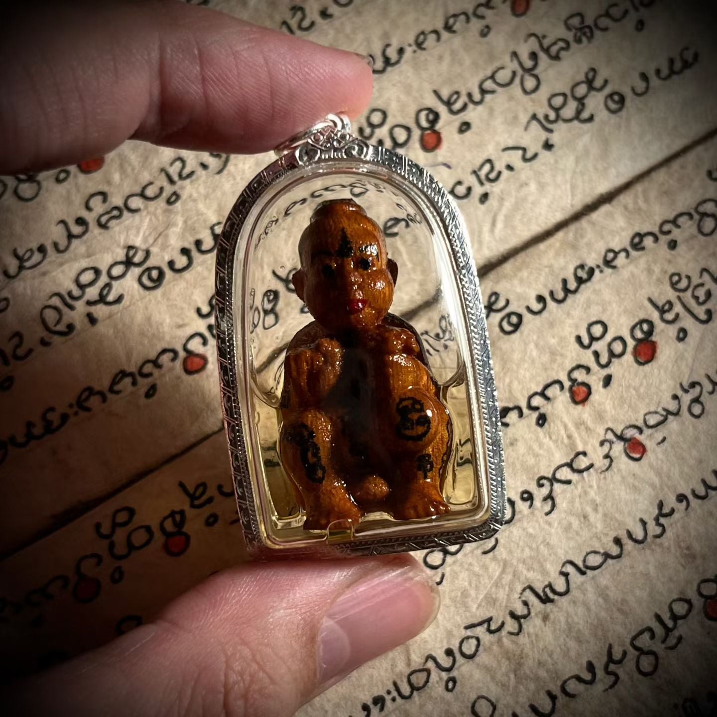 阿赞Nok以横死孕妇棺椁为媒介通灵招魂,此古曼用黑法(概也沙)镇魂约束并增强灵体功力,写安抚灵魂符咒、融合师傅特殊人缘符咒加持数周,背面部下镇魂法阵,灌注沙力嘎人缘油,绝无反s。