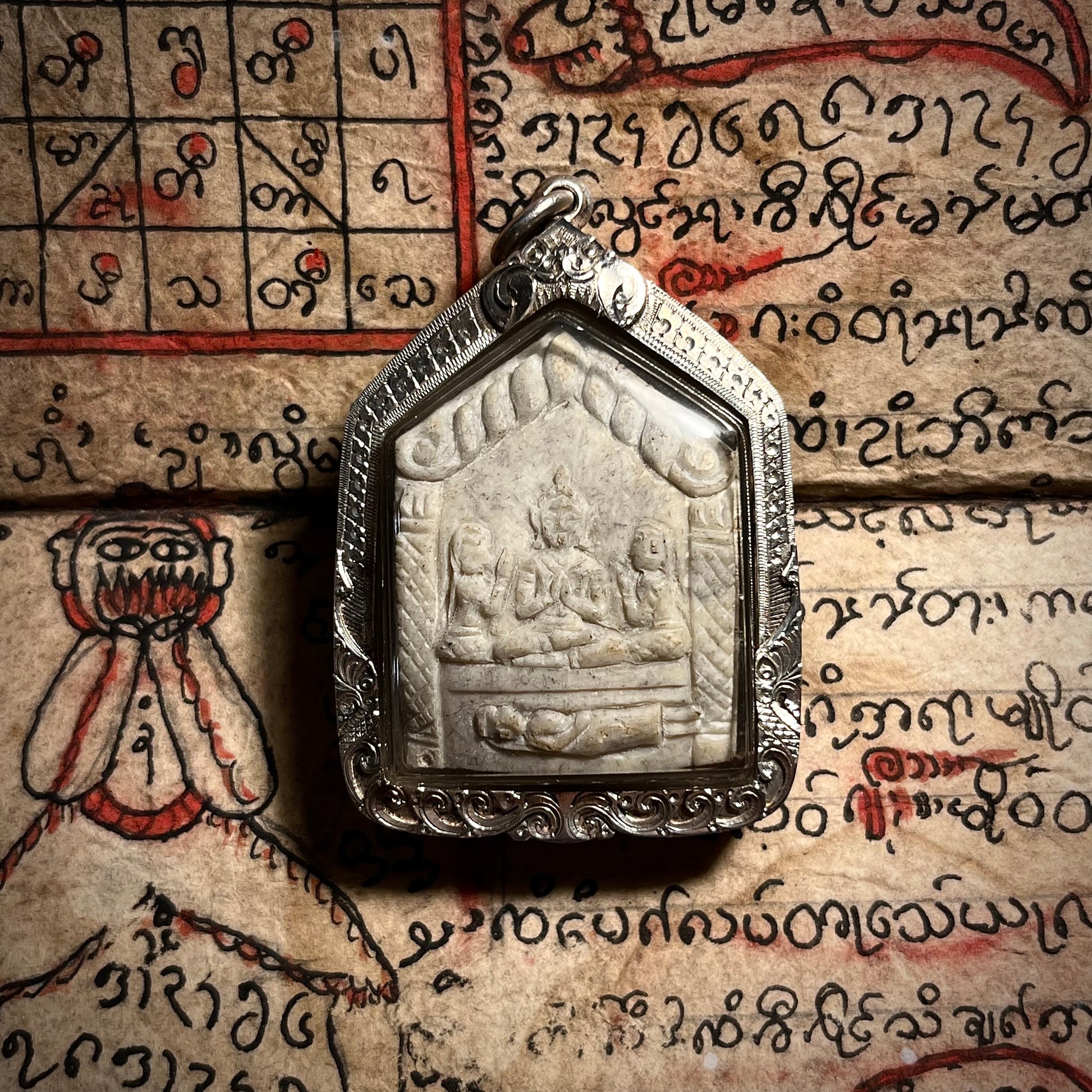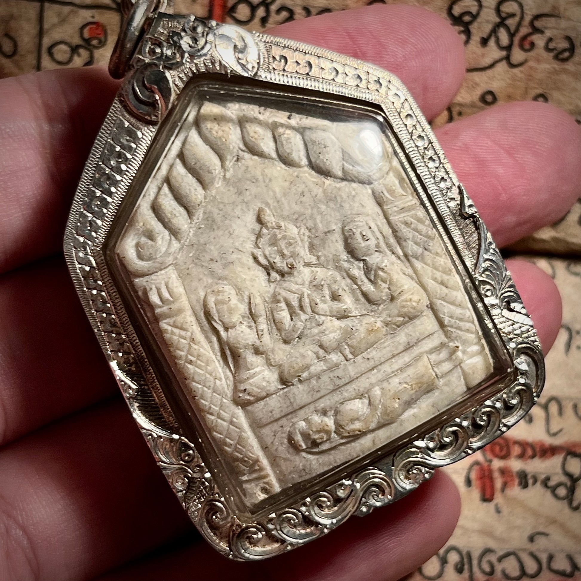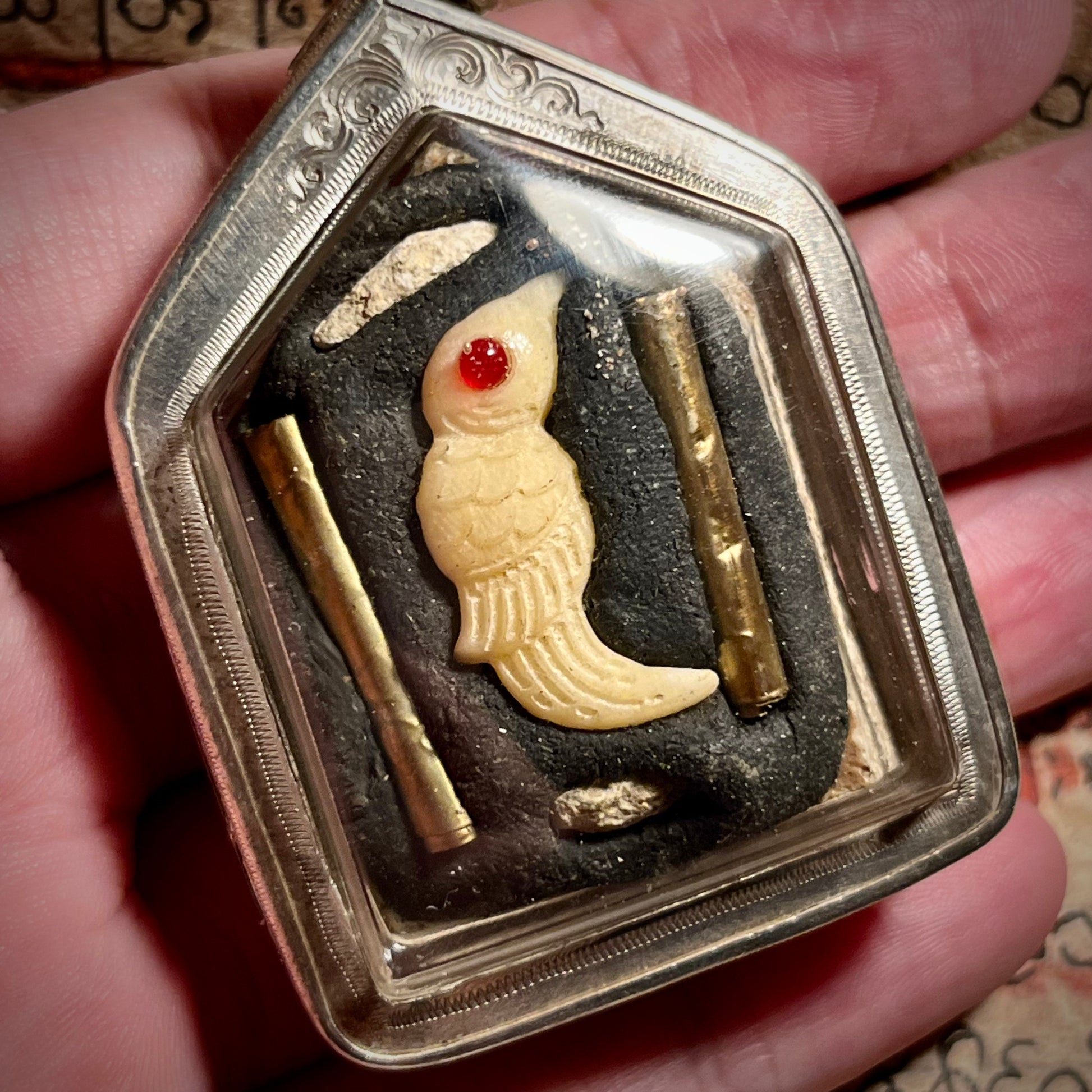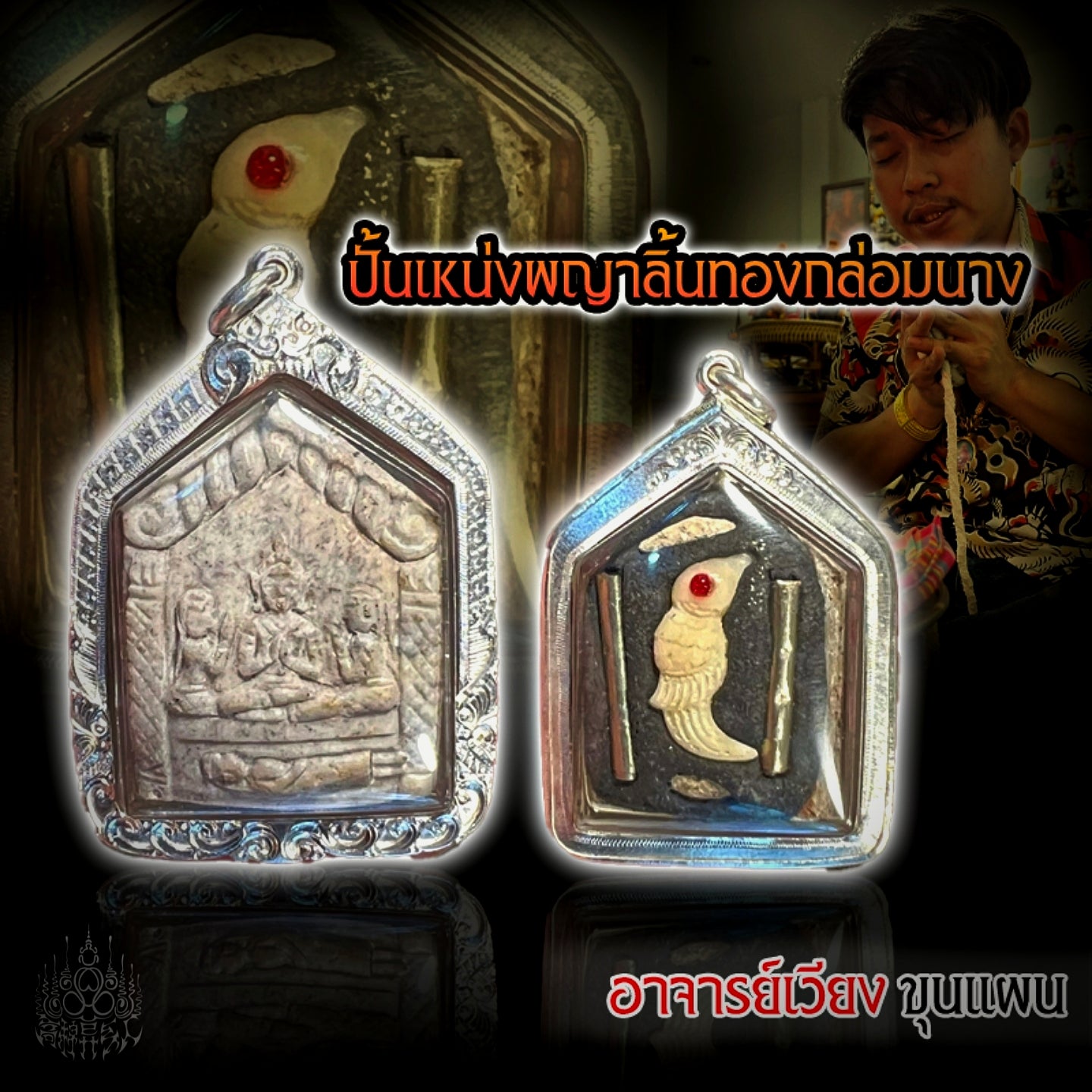 背部填充圣物:包含神圣植物粉末、魅力粉末,并嵌入由昭桑卡凯真言(Chao Sangka Kaew 来自崇迪阿赞多大师)开光的圣鸟沙利嘎、金龙舌护身符管、银质魅力符管以及神圣的米化石。