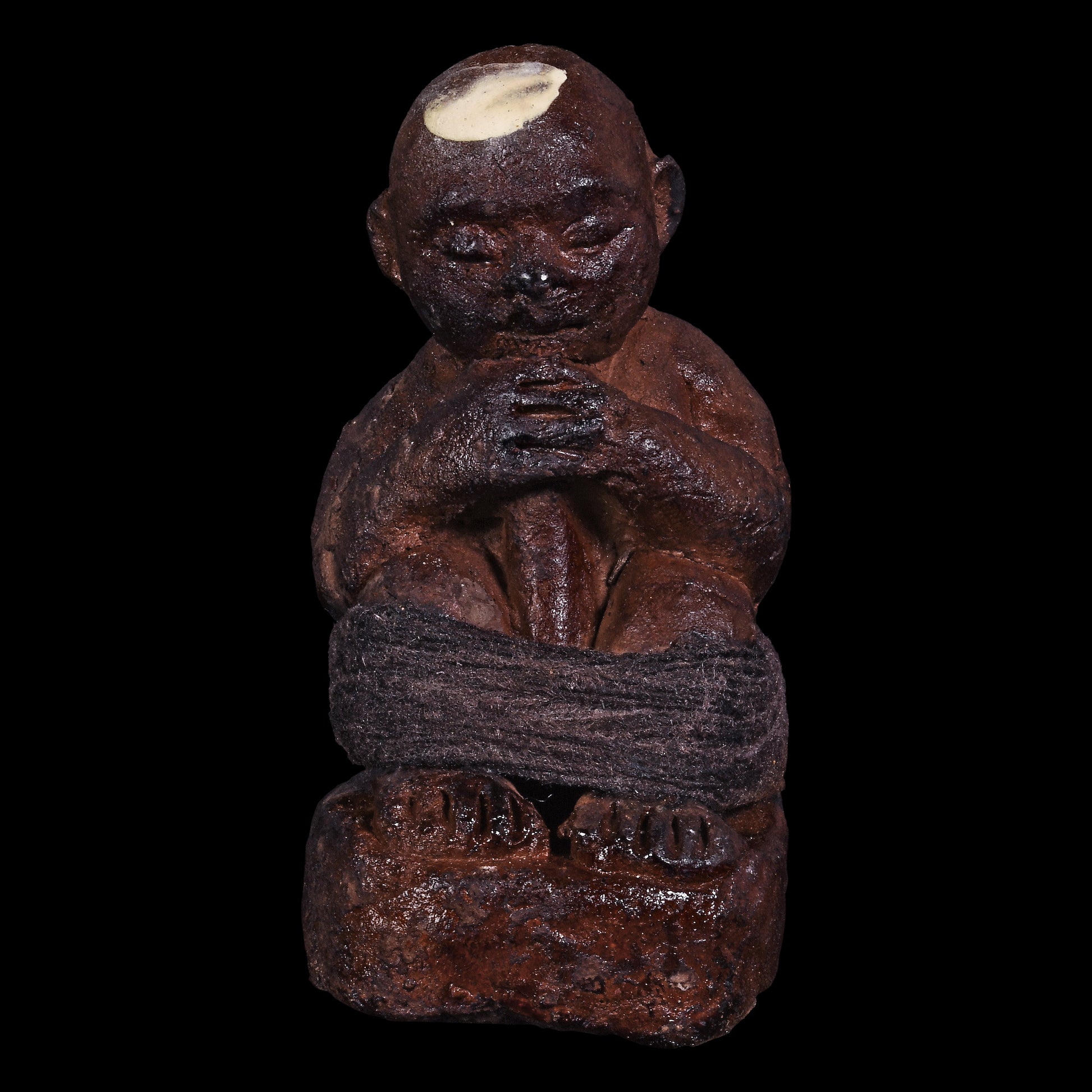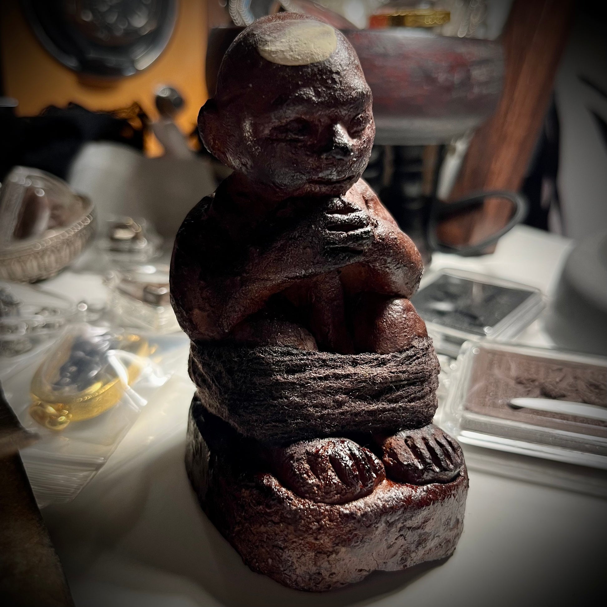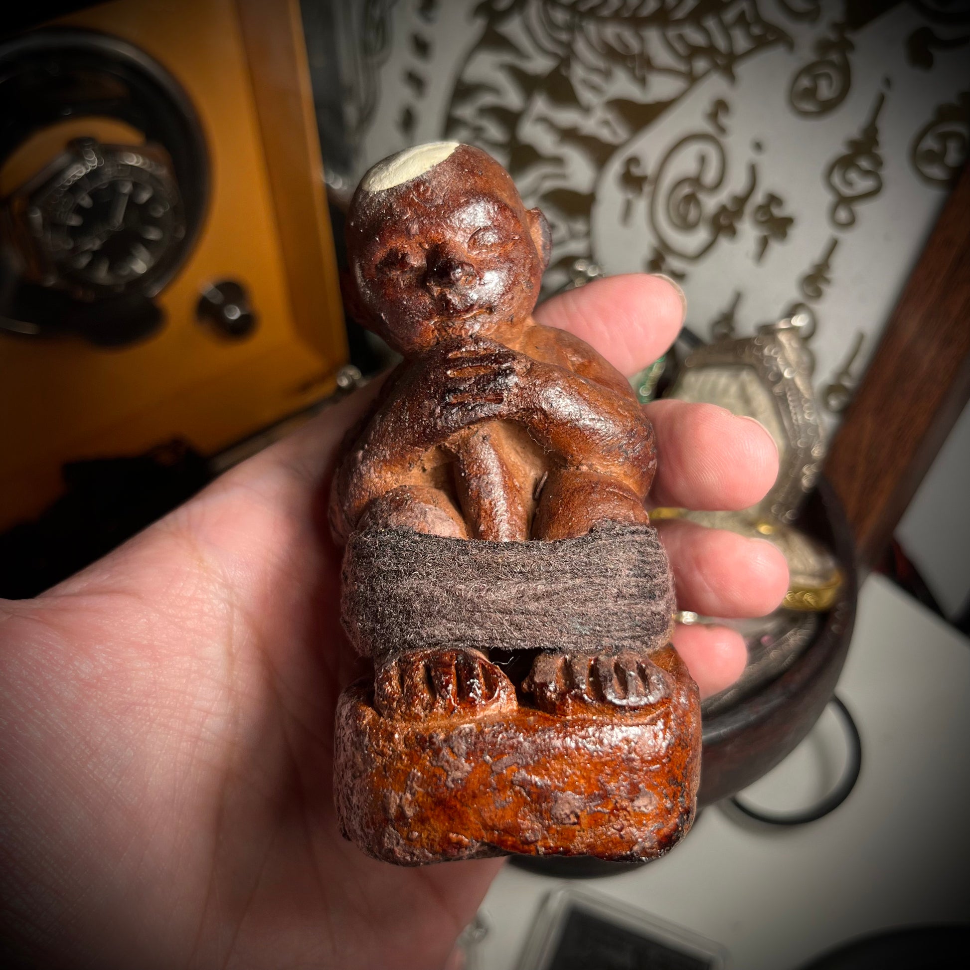 此圣物为泰国高僧龙婆盖(武里喃府瓦考丁泰寺)督造,属高棉古老传承的古曼金童法门,俗称“胎盘灵童”或“吸胎灵童”。