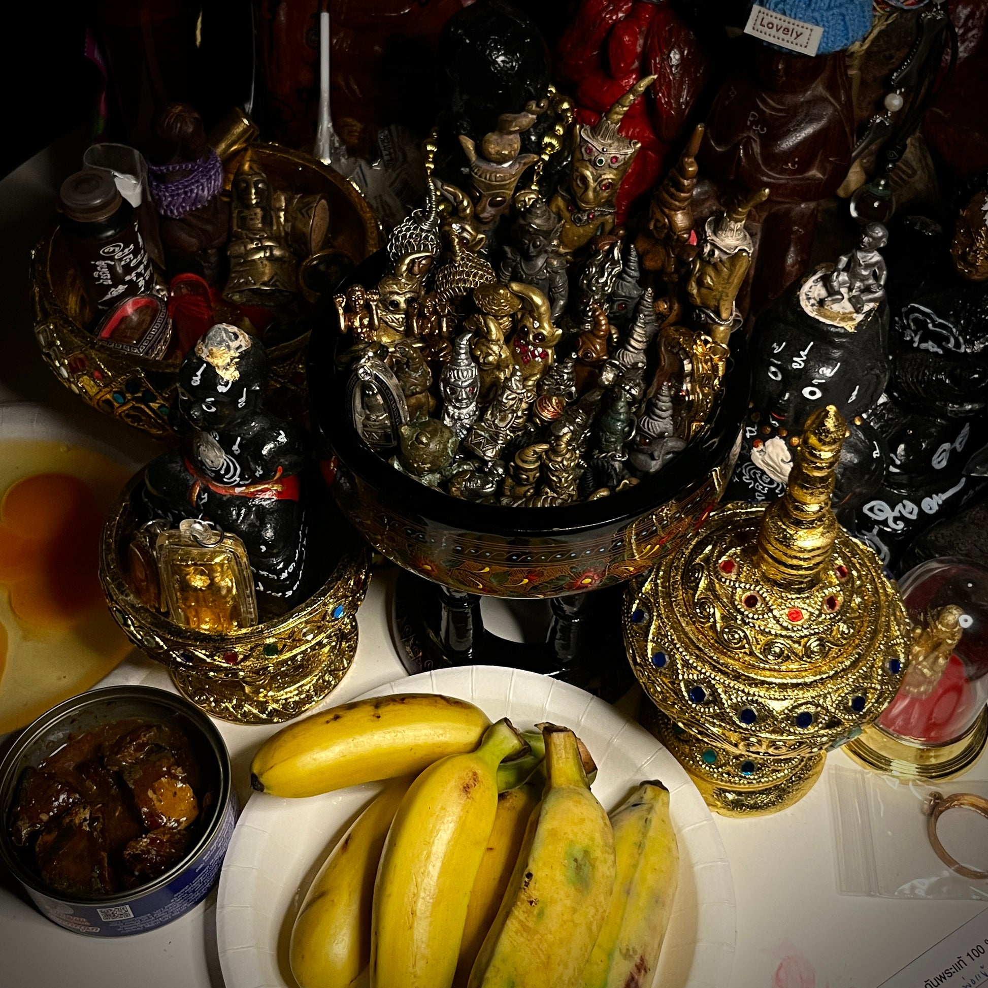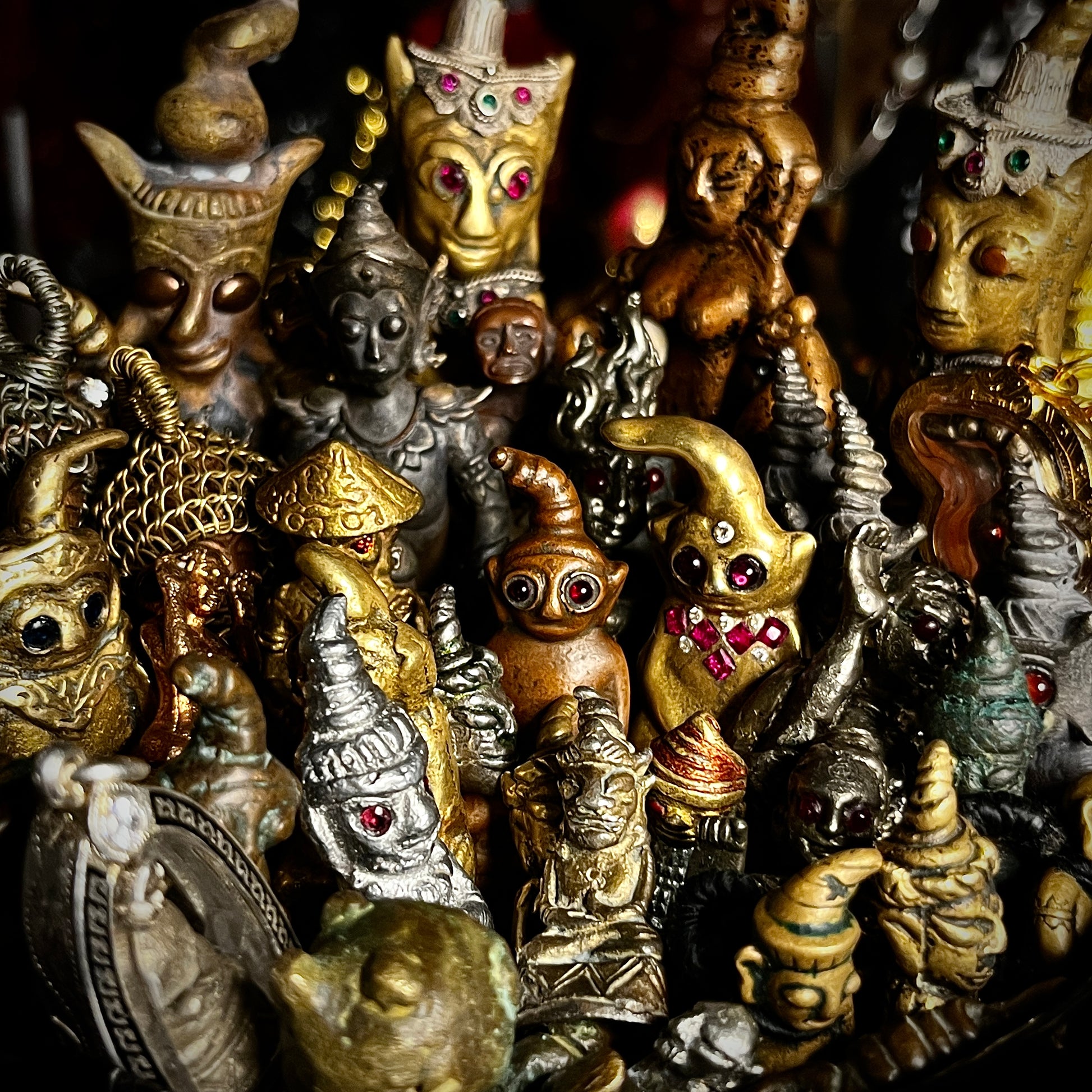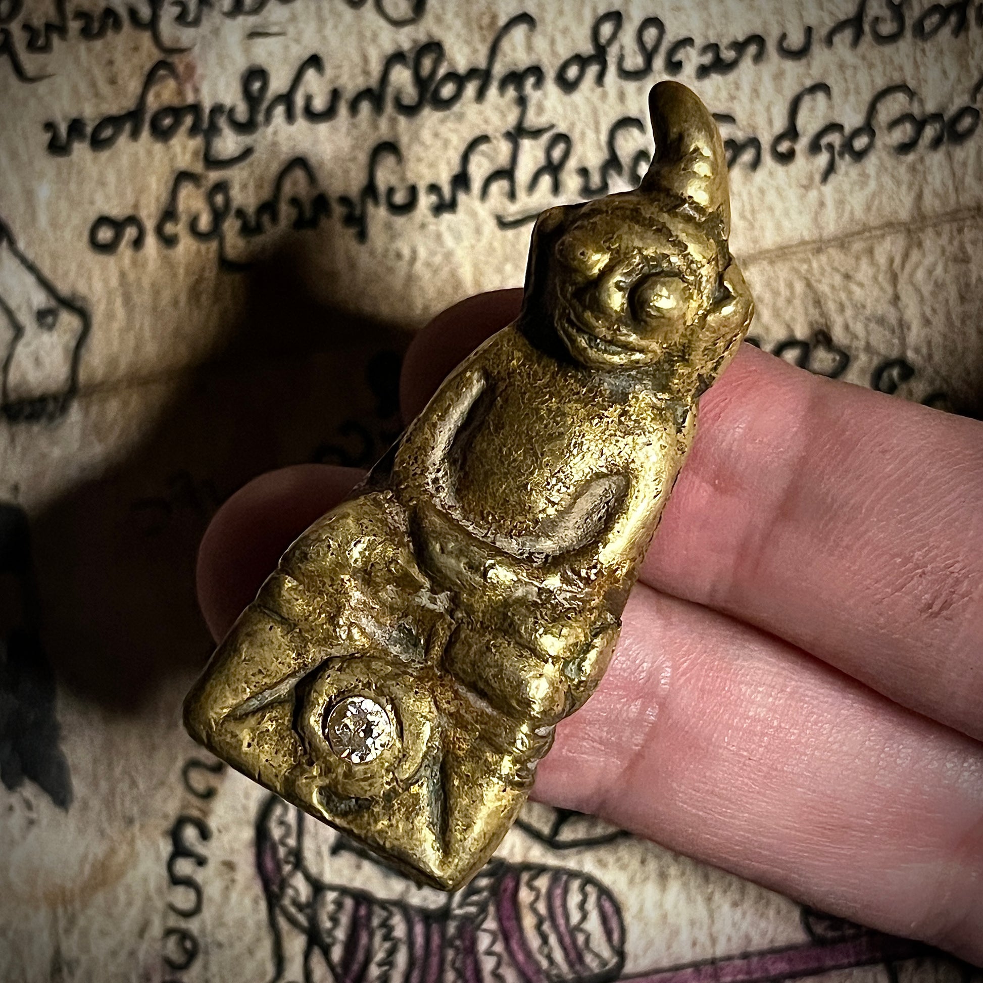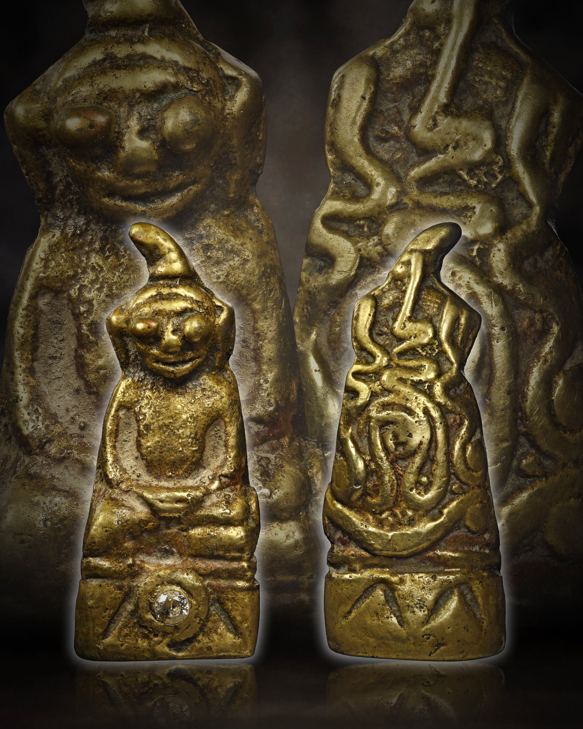 已还愿,镶嵌人造钻石;这尊铜像已有数十年历史。其亮点在于正面底座上刻有神圣数字,与泰国数字“1”相似。背面则饰有Yantra图案。